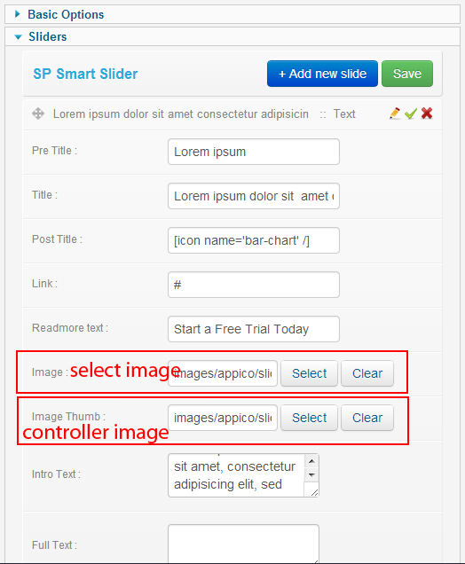This awesome slideshow settings provide you to select the title, post title, readmore text and intro text. From here users will also able to select the image source. Here is another option for the thumb image also.