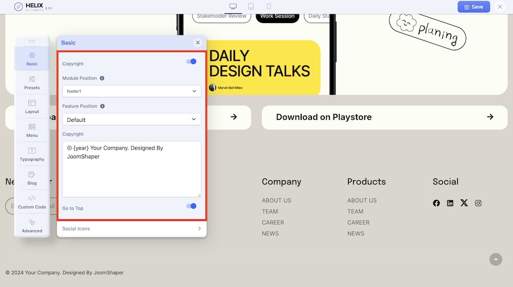 Here, you need to click on Basic and expand the Footer tab. From there, you will be presented with the option to enable Copyright. You can edit the module position where the copyright text will be displayed, the feature position for the copyright text (Before or after the module) and finally you can type the copyright text itself inside the text field. Click on “Save” once you are done.