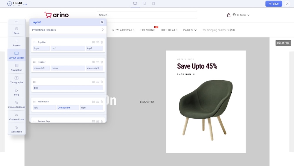 The following screenshot highlights the main layout module positions that we used in the current template. By using Layout Builder in Helix Ultimate, you're able to move positions or even change their sizes in the grid (based on Bootstrap 4). Our in-built layout builder from template settings provides you the opportunity to add new positions, columns, and rows wherever you need and to move the elements as much as you want. You can find more information & tips inside the Helix Ultimate Manual.