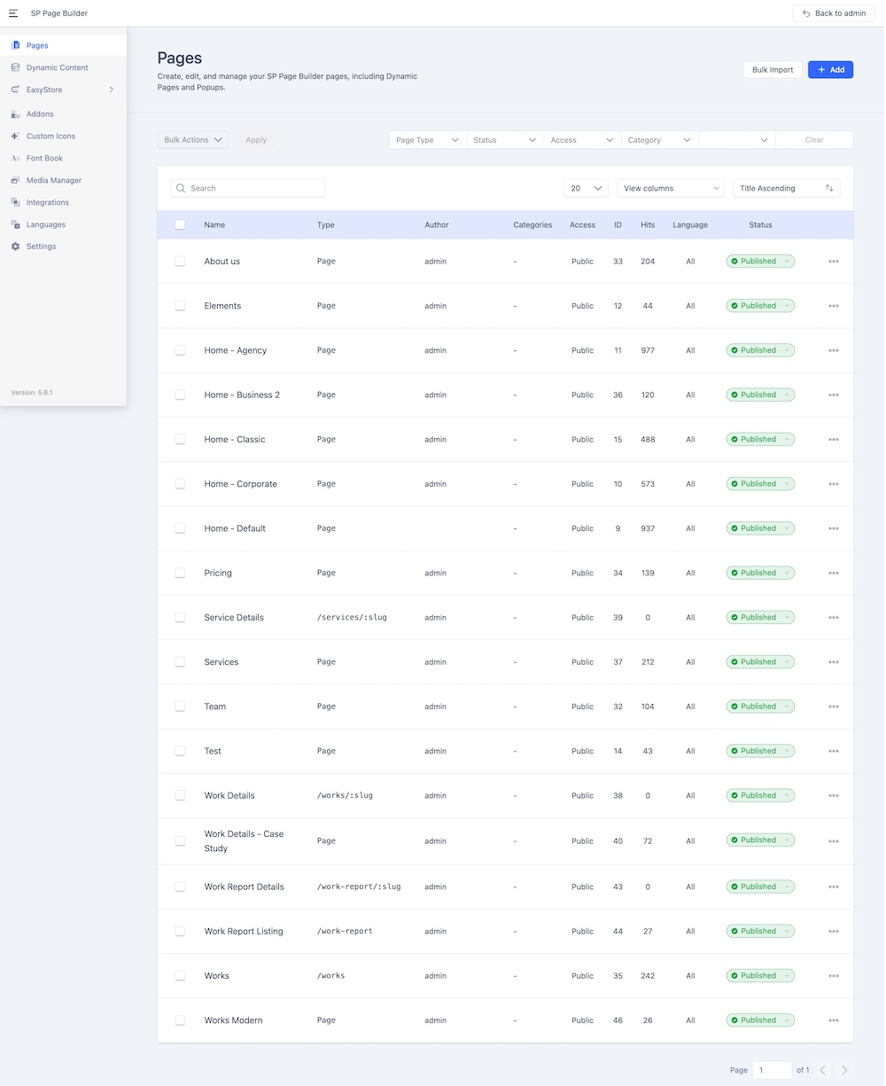 SP Page Builder dashboard includes all pages created with SP Page Builder Pro. Use SP Page Builder Pro's backend or front-end editor to edit or customize any page. To do that, from the Joomla dashboard, go to Components > SP Page Builder Pro > Pages and select the page you want to edit.