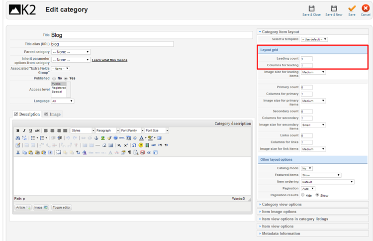 To cutomize the k2 blog we fixed four(04) leading count and one(01) columns for leading. In other layout options we select the pagination as Auto & we fixed the pagination results.