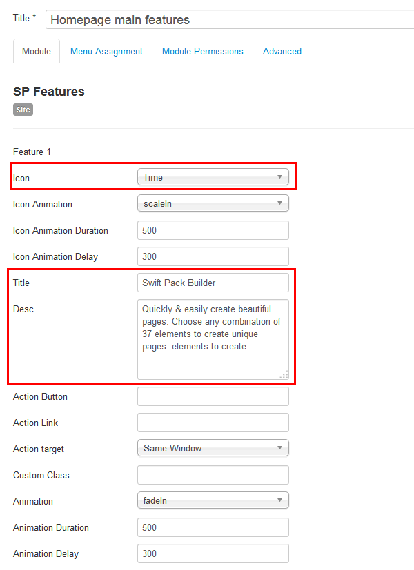 From Basic option we fixed the Icon, Title, description. We do the same to the others like Feature 2 & Feature 3. Remember to use "highlighted"  as a Module Class Suffix.