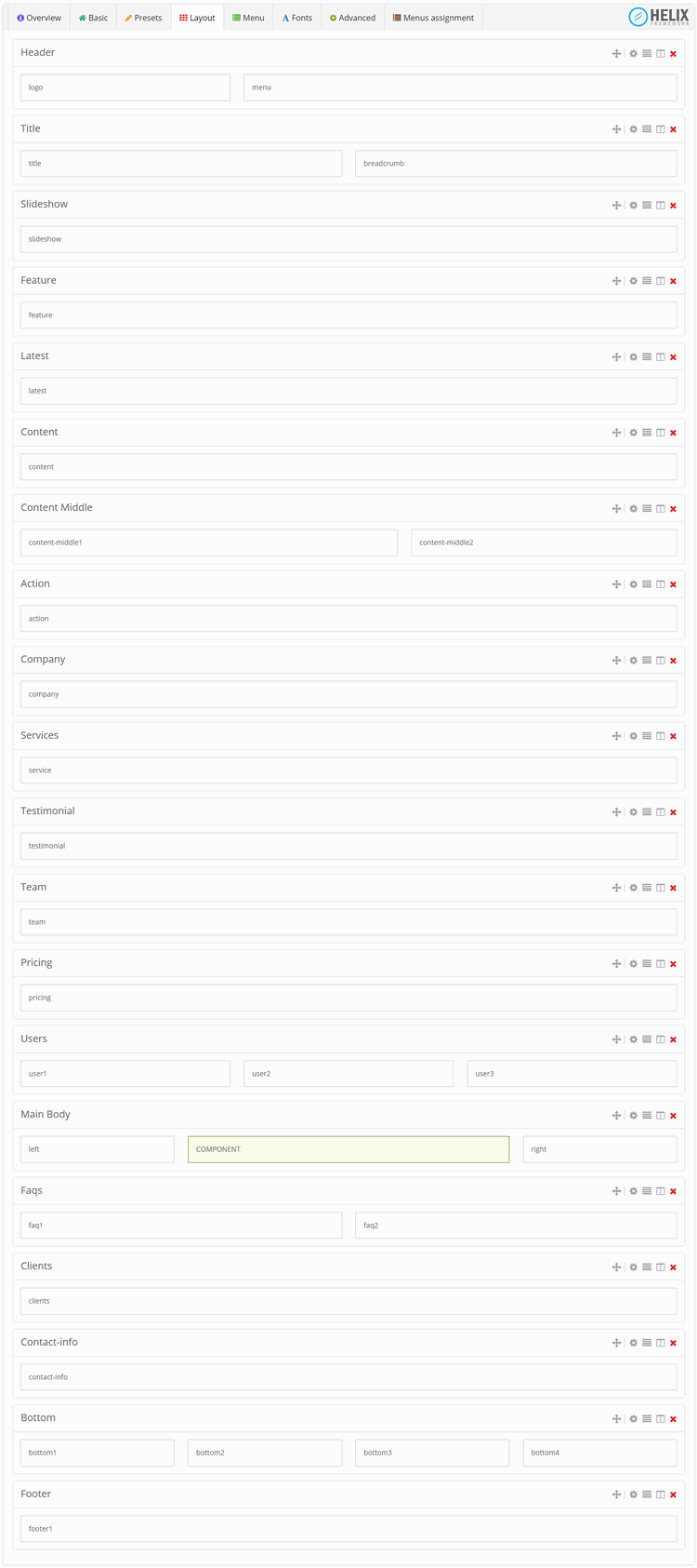 The screen-shot below highlights the default layout positions that we used in “Blinker” template. By using this layout builder users will be able to move positions or change its size. Our new & latest layout builder provide the opportunity to add positions where you want & no limitation for creating positions. From now its unlimited without touching a code inside template files.