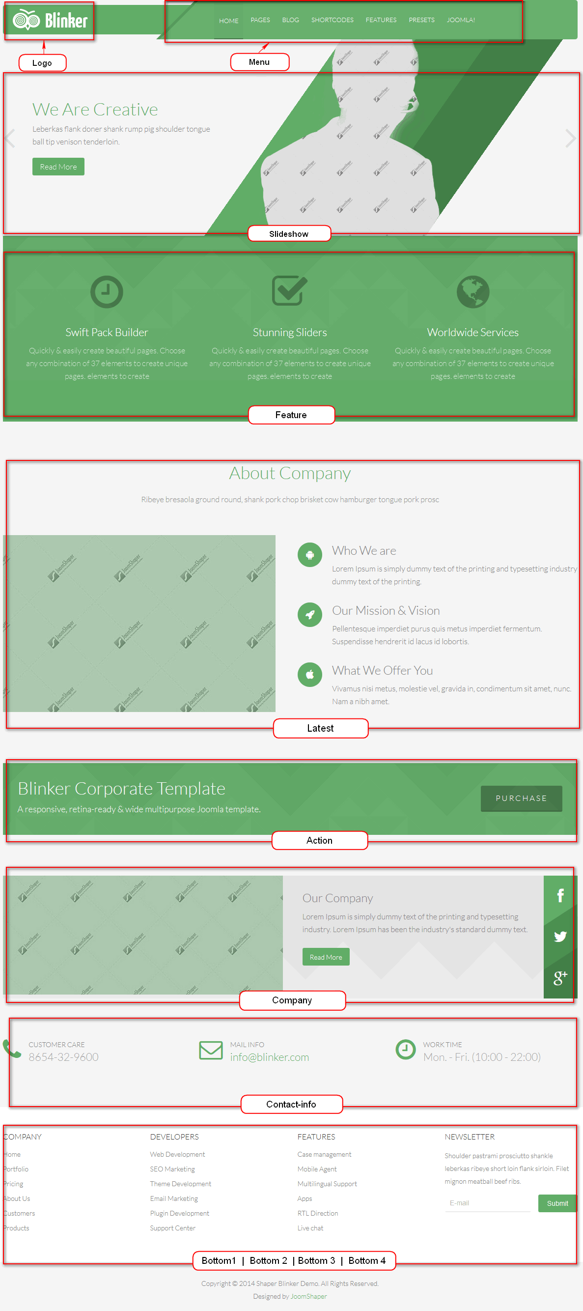 The following screenshot shows the detail view of "Blinker" Front Page with list of the module positions used in this template which contains modules in the demo content configuration: