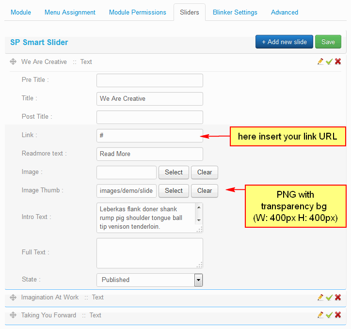 In our template demo we used SP Smart Slider module which was published on "slideshow" module position. Here we used 400px - 400px dimensions images for our sideshow, PNG format with transparency.