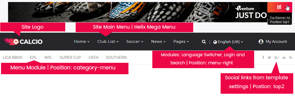 Top and Header Settings | Calcio - Documentation | JoomShaper