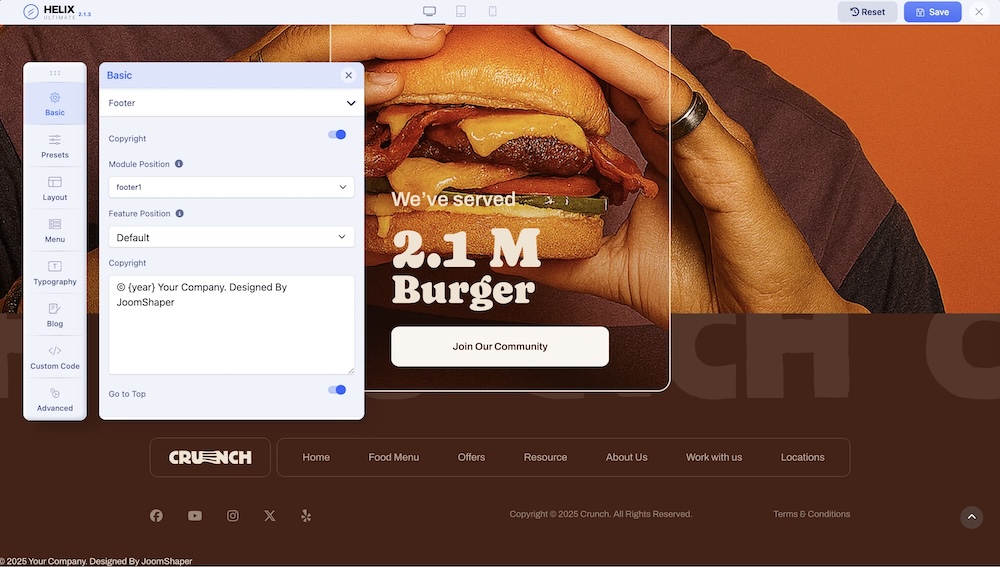 By default, Crunch template's copyright note module position is at the footer 1 position. You can also change your Module Position and Feature Position and edit the Copyright Note.