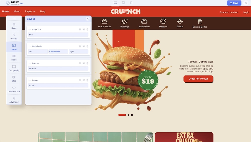 From the Helix Ultimate editor, select the Layout tab from the Sidebar. You will be presented with the option to customize the website layout used in this template.