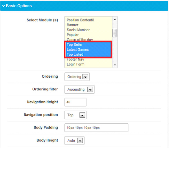 SP tab module presents content in tab format. From Basic options “Top Seller”, “Latest Games” and “Top Listed” module have been selected for showing it.