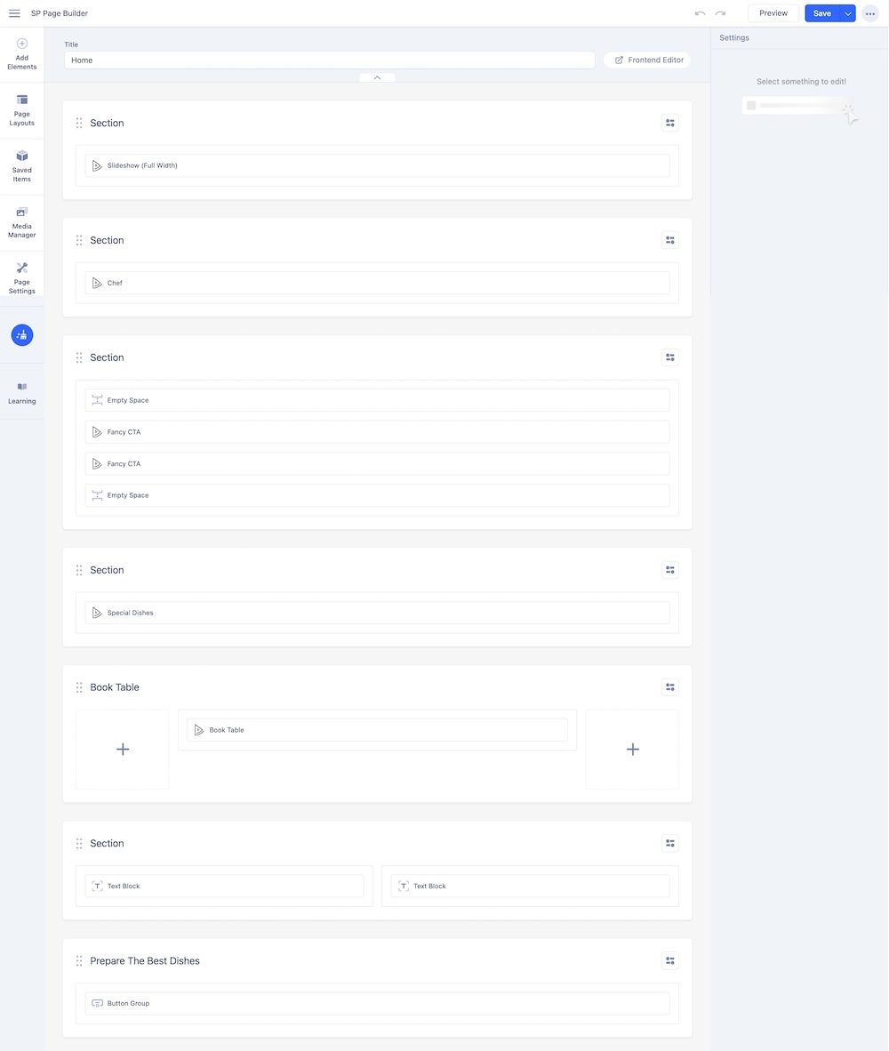 The screenshot below illustrates the Cuisine template settings for the Home page, including the SP Page Builder addons used in the demo configuration. Although the demo Home page was assembled with SP Page Builder Pro, you may recreate a similar appearance using only Joomla modules. Employing SP Page Builder, however, streamlines the design workflow and accelerates customization.