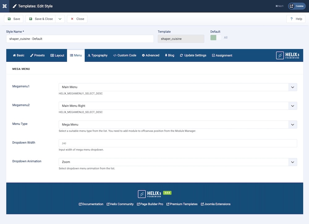 This template uses a specialized separated Mega Main Menu which enables independent configuration of left and right-side menus for enhanced navigation flexibility. Navigate to System > Site Template Styles > shaper_cuisine – Default > Menu to access the options. A screenshot of the default menu settings is provided below.
