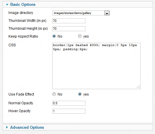 From Basic Options Image file path have to put.Thumbnail Width and Height,Kepp Aspect ratio,CSS etc have to be fixed also.