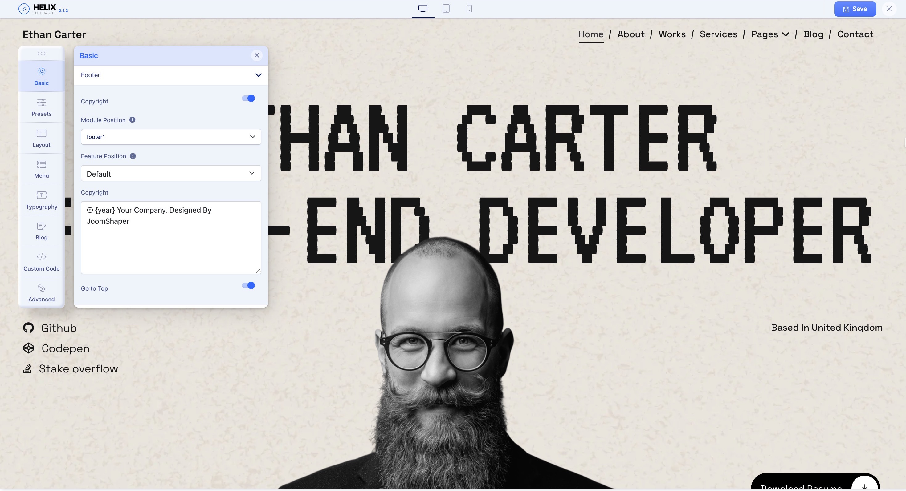 From the Helix Ultimate editor, select the Layout tab from the Sidebar. You will be presented with the option to customize the website layout used in this template.