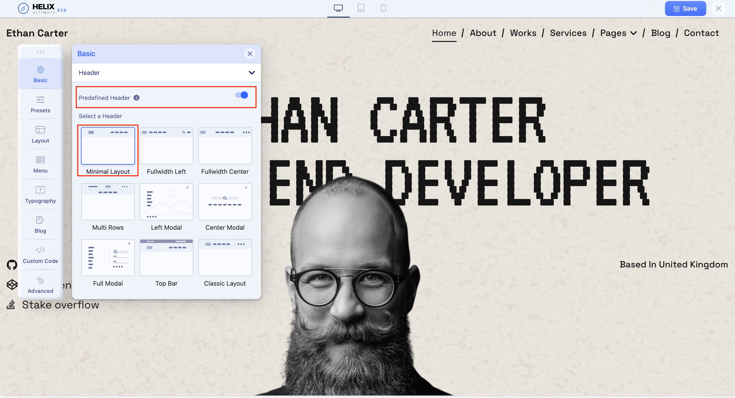 Upon enabling the Predefined Header option, you can find the header layout used in this template. You will be presented with a series of header layouts. For this template, the Minimal Layout header has been used. You can easily adjust this by selecting the other available layouts in this option that best suit your needs.
