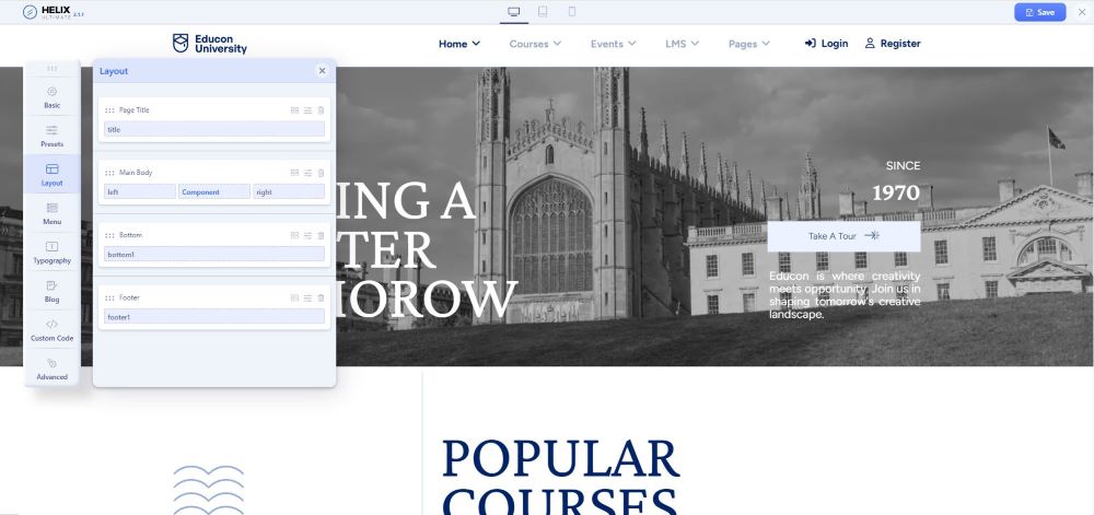 From the Helix Ultimate editor, select the Layout tab from the Sidebar. You will be presented with the option to customize the website layout used in this template.