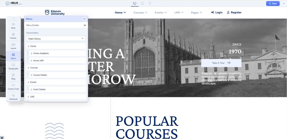 To explore the Educon template's menu settings through the Helix Ultimate editor, start by accessing your Joomla admin panel. From there, go to System > Templates > Site Template Styles > Select educonII default > Template Options. In the sidebar, click on the Menu tab, where you'll find three menu configuration options: Menu Builder, Mega Menu, and Off-canvas Menu.