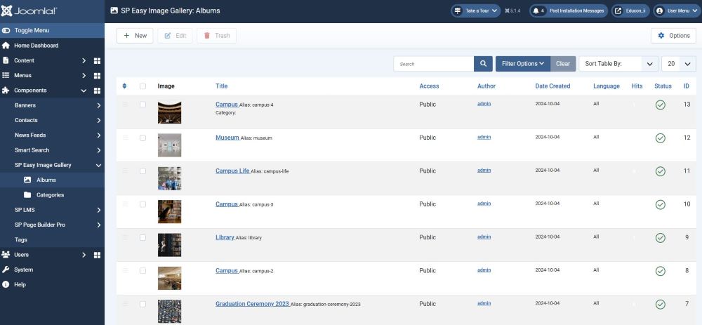 Educon II Joomla template comes with 2 components: SP LMS and SP Easy Image Gallery. You can access this components from the Joomla Admin Panel > Components > SP LMS / SP Easy Image Gallery.