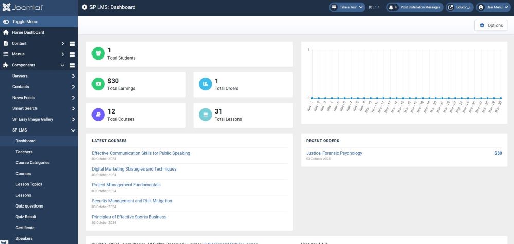 After accessing the SP LMS component from your Joomla dashboard, you will find the existing courses, categories, quizzes, lessons used in the Educon template. You can easily manage and edit any of these by clicking on the individual items.