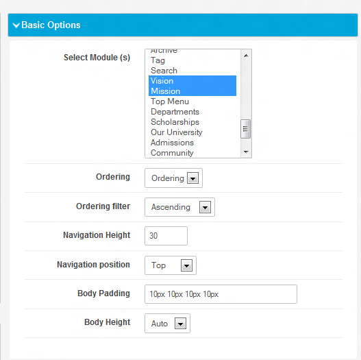 Sp Tab module featuring this.From Basic option Vision and Mission have been selected.Navigational height and Body height has also fixed up.