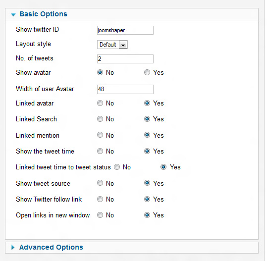 From Basic options give twitter Id at show twitter ID field.Layout style is Default.