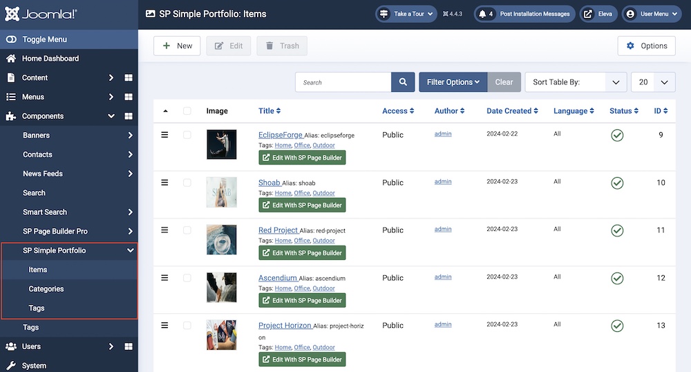 To access SP Simple Portfolio from your backend dashboard, navigate to Components > SP Simple Portfolio. Here, from the SP Booking Dashboard, you’ll see a list of your portfolio items.