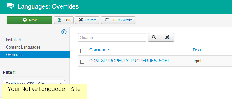 You can translate only selected phrases, using Joomla! Language Override, in Joomla (Top Menu): Extensions > Language Manager > Overrides tab. In the Language Constant input field insert, for example: “COM_SPPROPERTY_PROPERTIES_SQFT” without quotes – then in next field your translated phrase, for example, sqmtr.