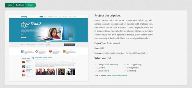 Articles of portfolio category are shown after clicking on images.