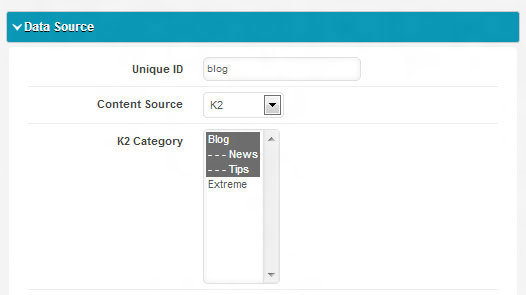 Blog display by News show SP2 module.From Data Source options k2 is selected as Content Source