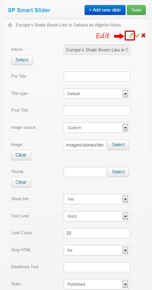 Add new slide button to add a new slide. See the screen shot bellow how to add article and image.