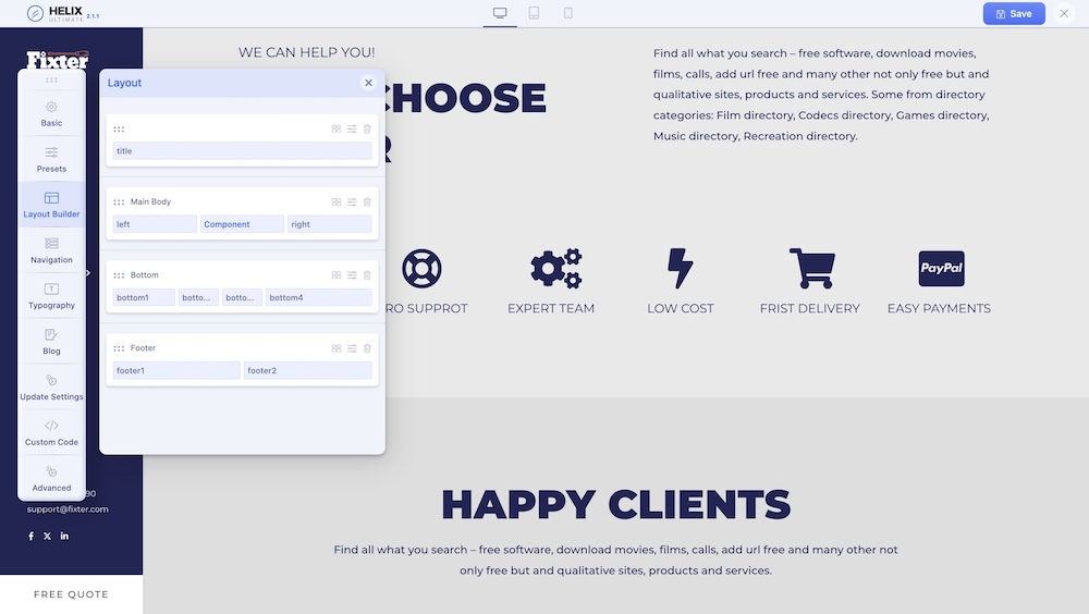 The following screenshot highlights the layout module positions that we used in the current template. By using Layout builder in Helix Ultimate, you're able to move positions or even change their sizes in the grid (based on Bootstrap 4). Our in-built layout builder from template settings provides you the opportunity to add new positions, columns, and rows wherever you need and to move the elements as much as you want. You can find more information & tips inside the Helix Ultimate Manual.