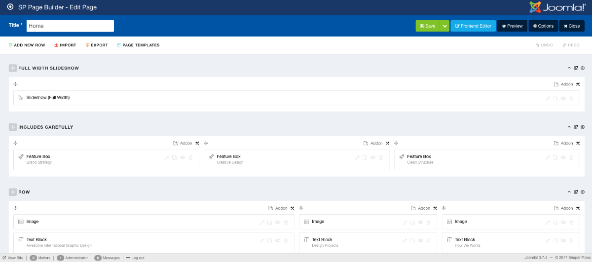 For frontend editor you just have to click the frontend editor on top of SP Page Builder and login to your template. Now click edit page. With this frontend editor will be activated. You can enjoy amazing drag and drop also row option editing functionalities with the editor.