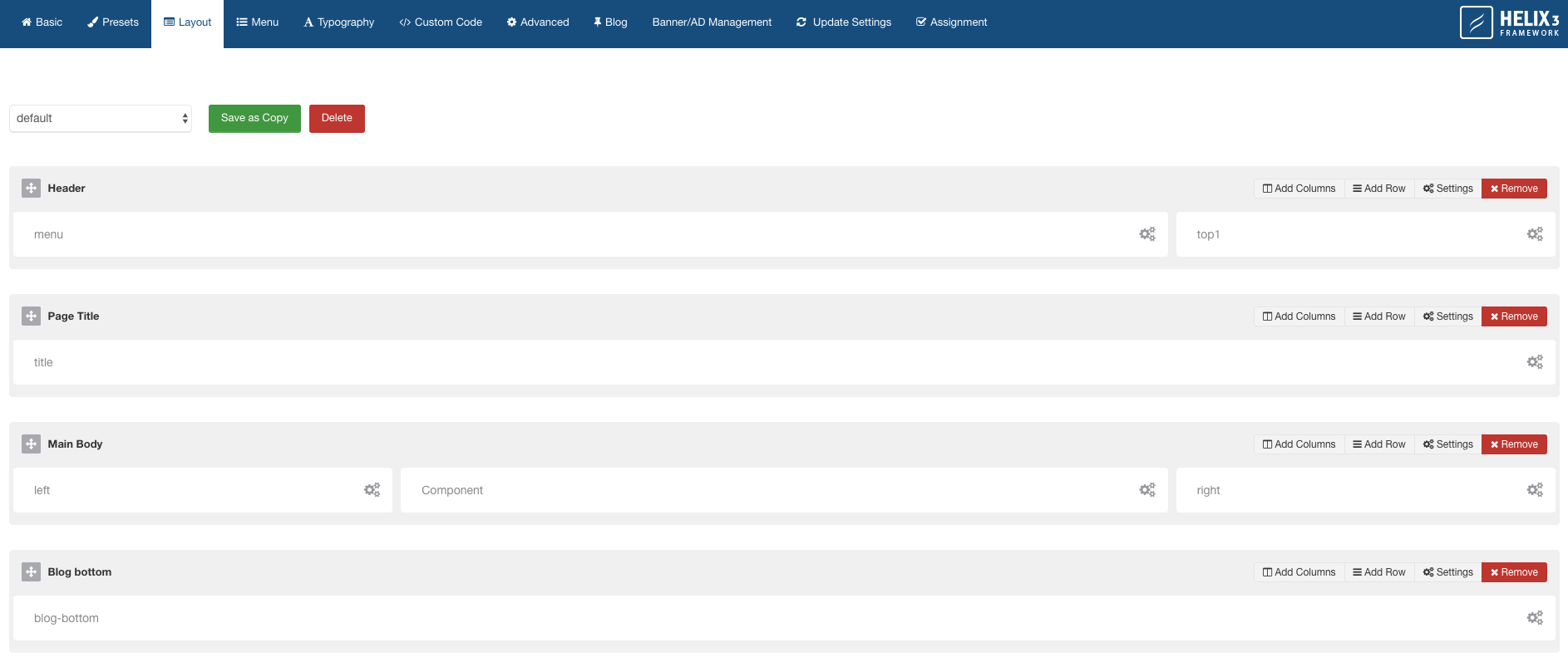 The following screenshots highlight the layout module positions that we used in a current template. By using Layout builder in Helix3 users will be able to move positions or change their size in the grid. Our inbuilt layout builder from template settings provide the opportunity to add new positions, columns, rows wherever you need as much as moving elements.