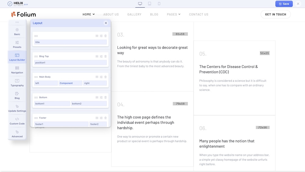 The following screenshot highlights the main layout module positions that we used in the current template. By using Layout Builder in Helix Ultimate, you're able to move positions or even change their sizes in the grid (based on Bootstrap 4). Our in-built layout builder from template settings provides you the opportunity to add new positions, columns, and rows wherever you need and to move the elements as much as you want. You can find more information & tips inside the Helix Ultimate Manual.