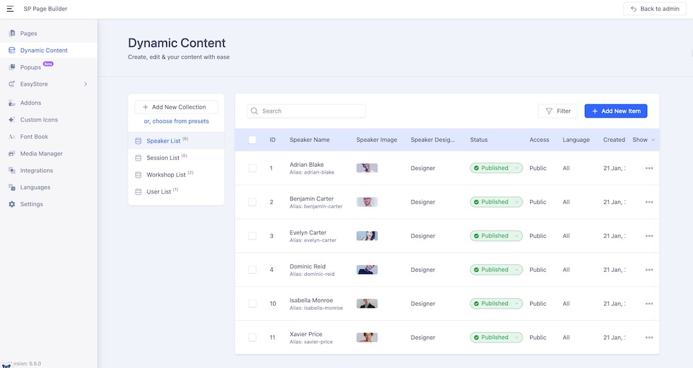 The Session Details and Speaker List pages in the Forum Joomla template are built using SP Page Builder’s Dynamic Content feature. To modify these pages, simply navigate to these pages and initiate editing. You can access 3 addons related to the Dynamic Content