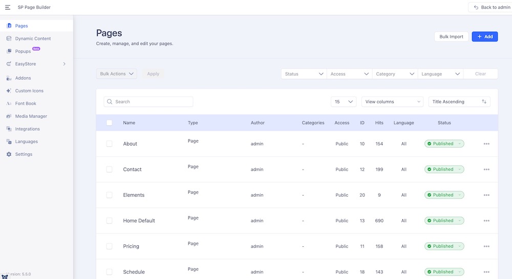 SP Page Builder dashboard includes all pages created with SP Page Builder Pro. Use SP Page Builder Pro's backend or front-end editor to edit or customize any page. To do that, from the Joomla dashboard, go to Components > SP Page Builder Pro > Pages and select the page you want to edit.