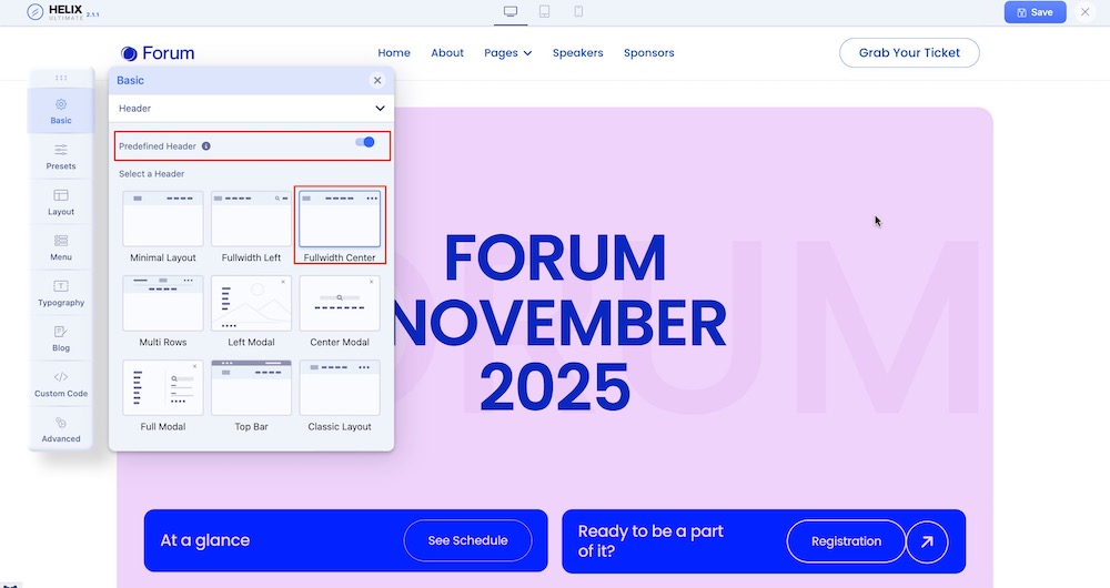 Upon enabling the Predefined Header option you can find the header layout used in this template. You will be presented with a series of header layouts. For this template, the Fullwidth Center header has been used. You can easily adjust this by selecting from the other available layouts in this option that best suit your needs.