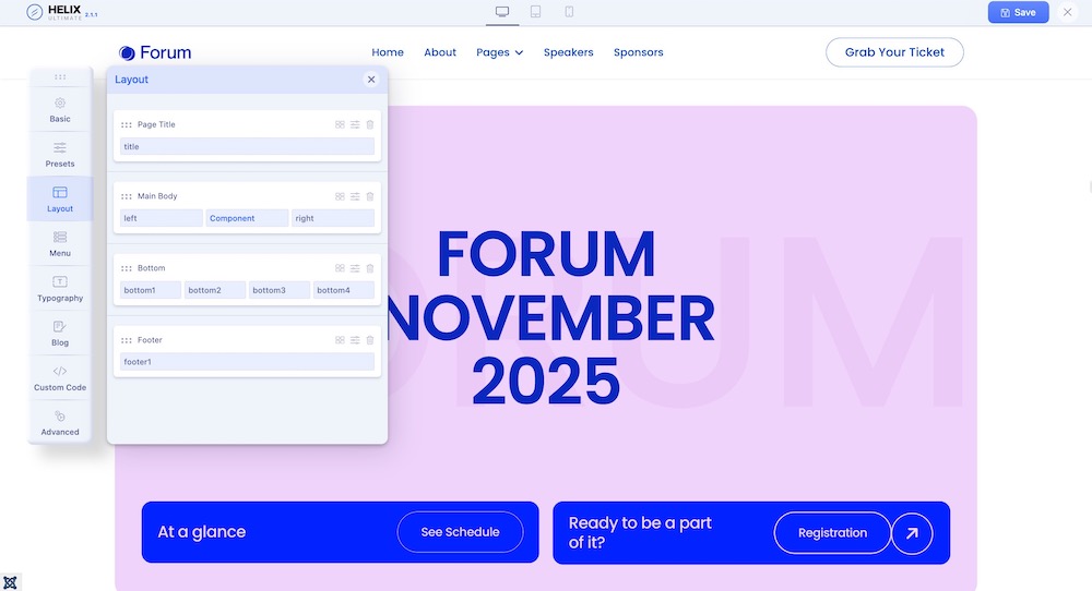 From the Helix Ultimate editor, select the Layout tab from the Sidebar. You will be presented with the option to customize the website layout used in this template.