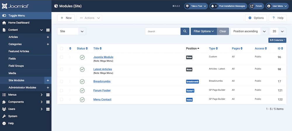 You can easily find the modules in the Forum Joomla template by navigating to the Joomla Admin Panel > Content > Site Modules. From here you can see the list of published and unpublished modules.