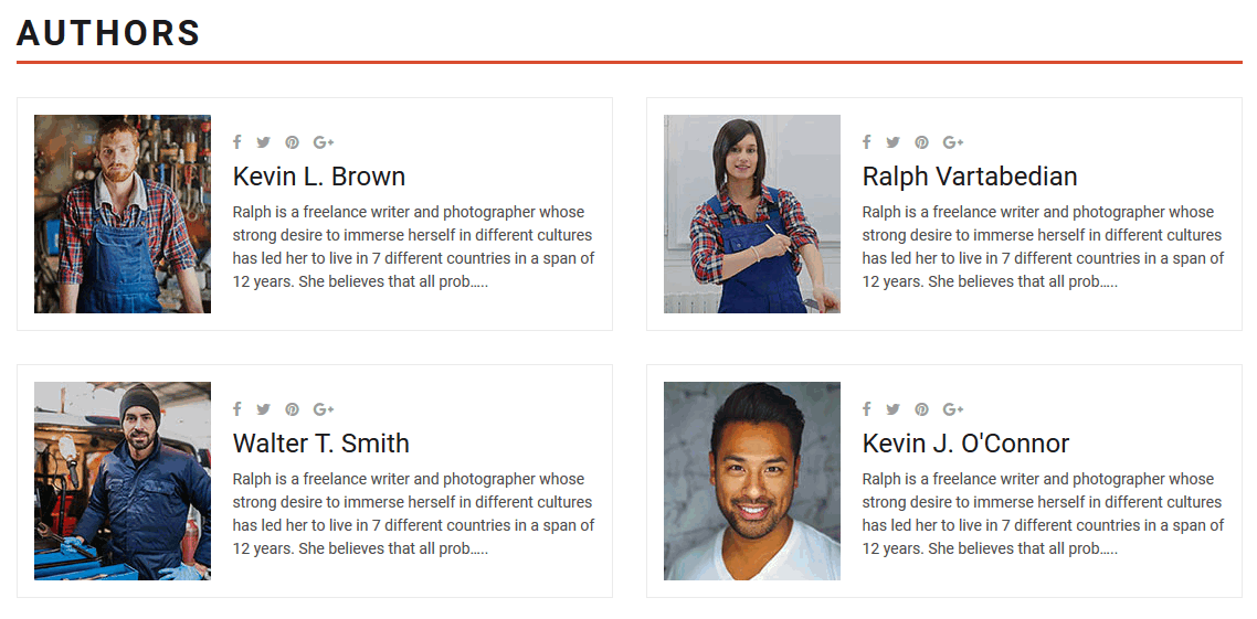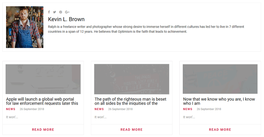 Each article author can have its own Profile page. If you used K2 component before, this is very similar solution. It's based on custom JoomShaper extension SP Author Archive. It contain and display: Author image, social links, short bio and, of course, list of articles written by him so far.