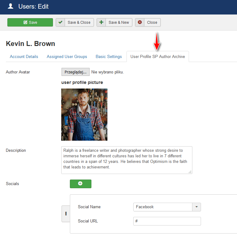 You have access to author data's from core Joomla User manager - Users: Edit > "User Profile SP Author Archive" tab