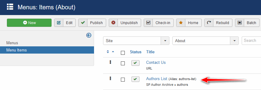 SP Author Archive - is "hidden" component it also means that you can add to menu "Authors list" to get short URL alias.