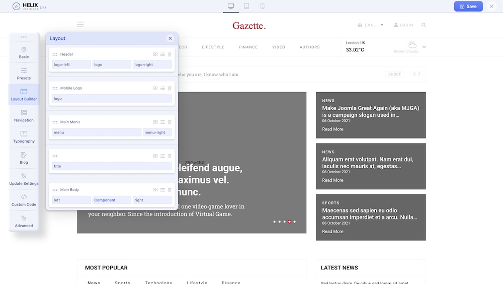 The following screenshot highlights the layout module positions that we used in the current template. By using Layout builder in Helix Ultimate, you're able to move positions or even change their sizes in the grid (based on Bootstrap 4). Our in-built layout builder from template settings provides you the opportunity to add new positions, columns, and rows wherever you need and to move the elements as much as you want. You can find more information & tips inside the Helix Ultimate Manual.