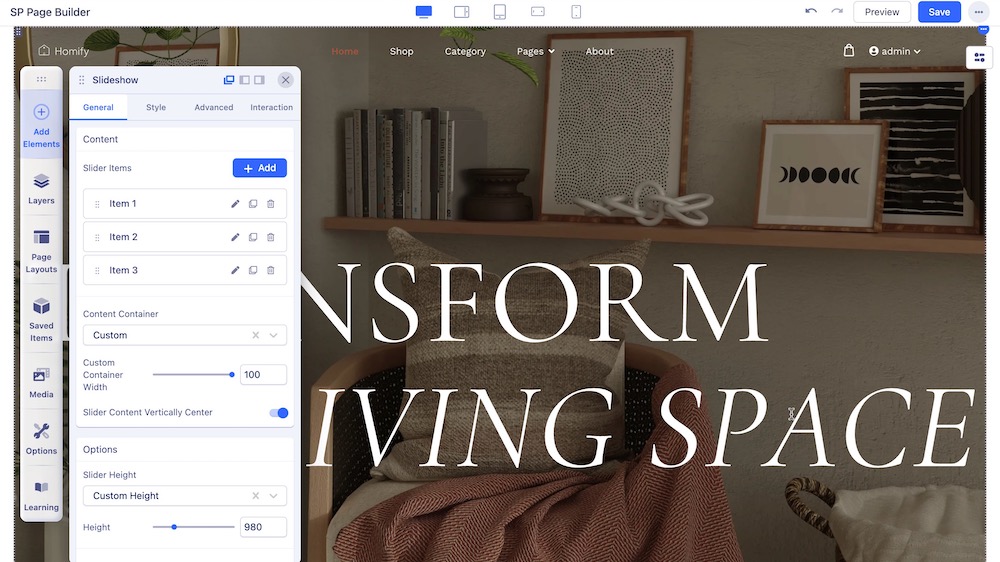 Homify Joomla template's QuickStart includes a pre-made home page created using the SP Page Builder 5 Pro component, and only from this component can be edited and customized. You can find it assigned to the Main Menu as a Home item. You can edit and customize the page using SP Page Builder 5 Pro’s backend & front-end editor. To do that, from the Joomla dashboard, go to Components > SP Page Builder Pro > Pages and select the page you want to edit.
