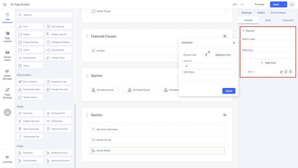 Choose icon: Choose which social media icon you want to add using the drop-down list of icons.