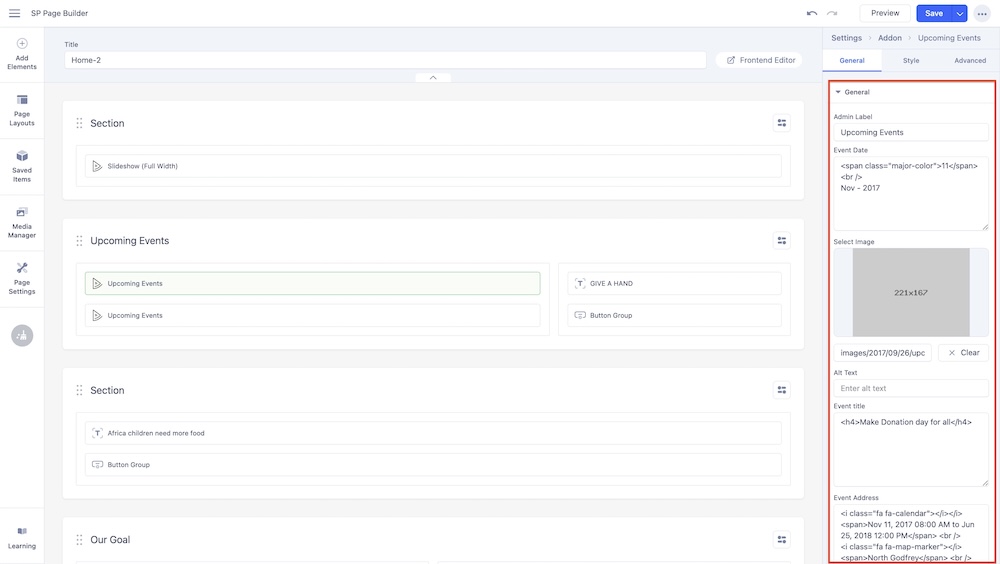 SelectImage: Upload the image of the event using the SP Page Builder media manager.