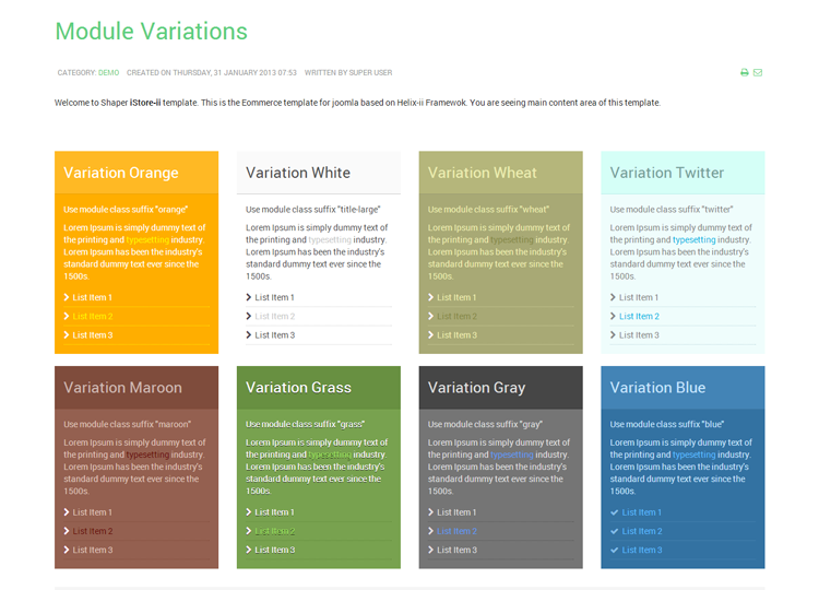 We provide a great number of module variation in iStore-ii. To select different module variation just select the class we provide. Here we used Module Class Suffix and the classes are orange, white, wheat, grass etc.