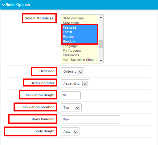 From options we select the modules which we want to show on this product sections. Here we also do some necessary work like ordering, navigation, body padding, body height etc which is necessary for this template.