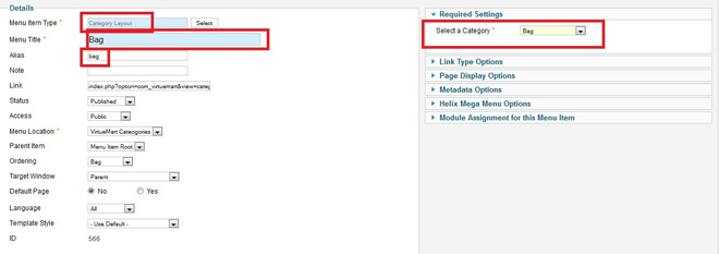 Menu Item Type will be “Category Layout”, Menu Title and Category Selection should be same,here both are “Bag”.