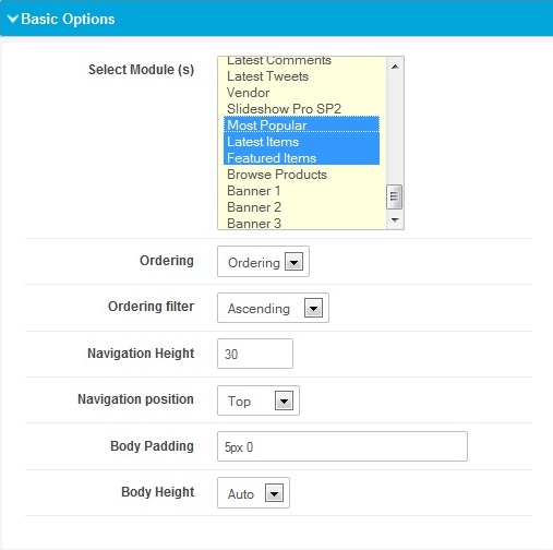 SP tab module presents content in tab format. From Basic options “Most Popular”, “Latest Items” and “Featured Items” module have been selected for showing it.