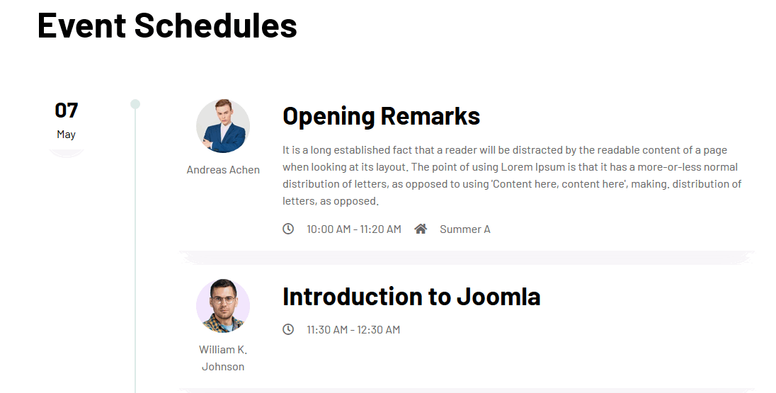 The template uses several powerful addons to enhance its functionalities and look. Almost all of them are from the default SP Page Builder Pro package. To improve events section we created/used new addons built especially for this template: